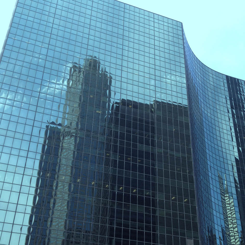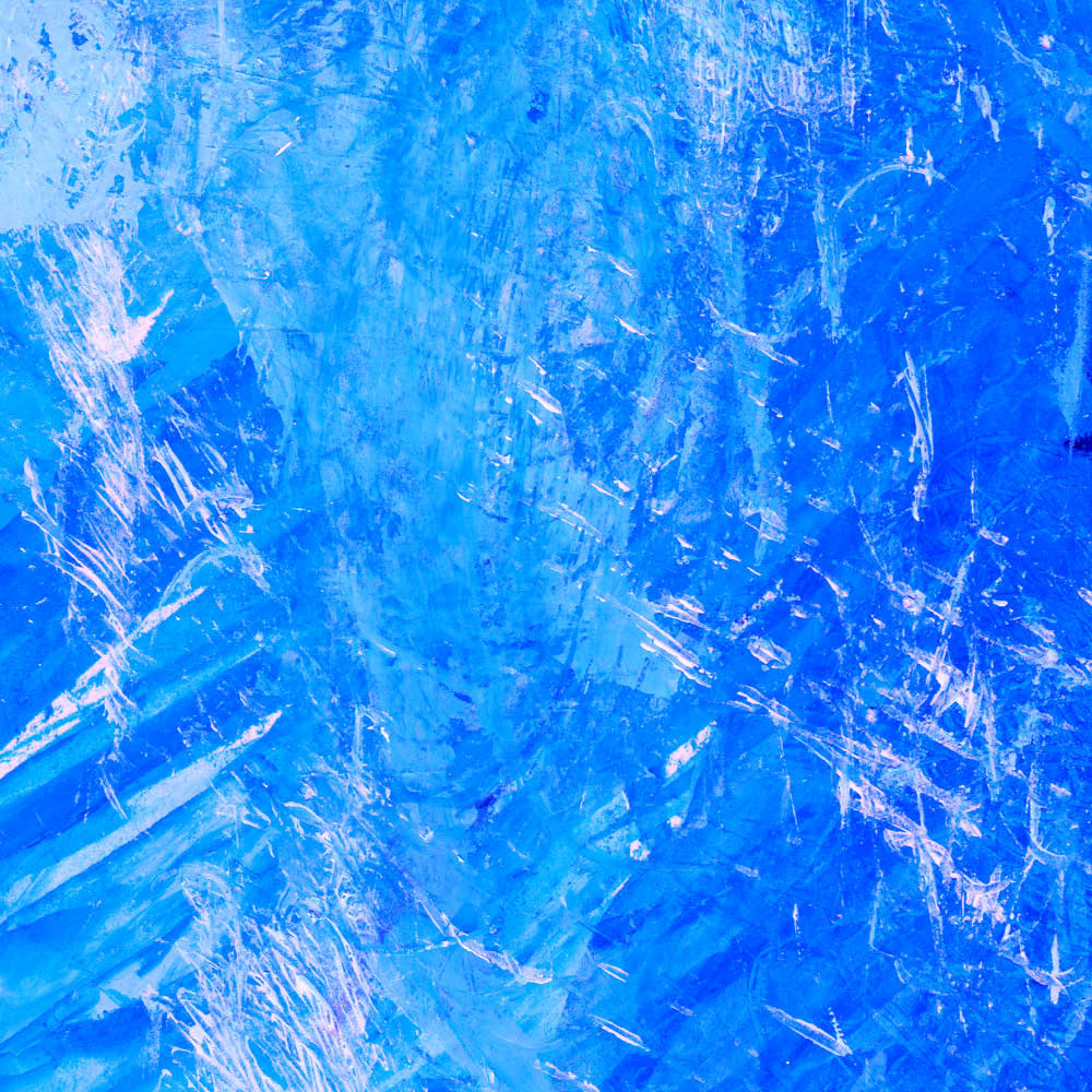 A square graphic cut up by crossing lines, all going in different directions; the shapes formed by the cuts are filled with shades of blue or photos that are naturally blue, including skies, clouds, paint textures, underwater life, and the side of a glass building.