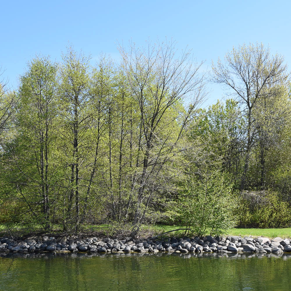 Below are four of the images used in the collage: a messy blue paint swatch; a calm river shoreline; a huge glass building; and a cloudy sky above a green field.