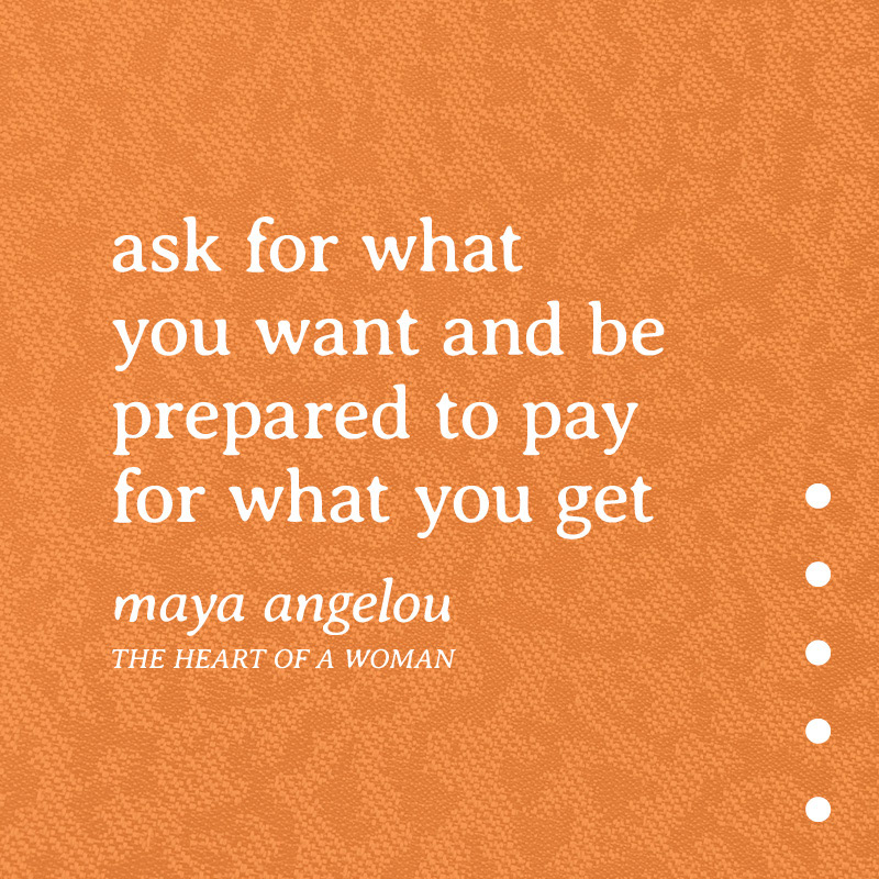 A quote by Maya Angelou reads “Ask for what you want and be prepared to pay for what you get”; the text is in a white serif font; the background is a wavy, orange surface; five little white dots ascend vertically in the lower right corner.